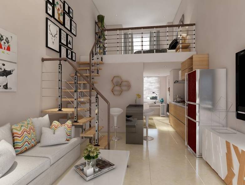 粉色墻面搭配淺黃色地板,營造比較中性與素雅的大環境,造型小清新的小樓梯為客廳增加了一些趣味性。