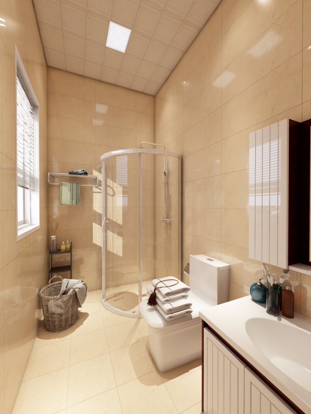 色彩搭配能改變對空間的感覺,鮮艷的色彩令小空間沒有壓抑的感覺。顯得衛生間干凈且明亮。暖色的燈光,將白色的墻磚變換成了淡淡的黃色,讓小小的衛生間了充滿了溫暖。