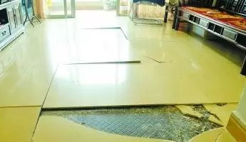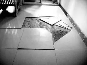 有圖有真相:無縫鋪貼的后果。北方某省某地飯廳某品牌拋光磚因不留縫鋪貼造成的嚴重后果。