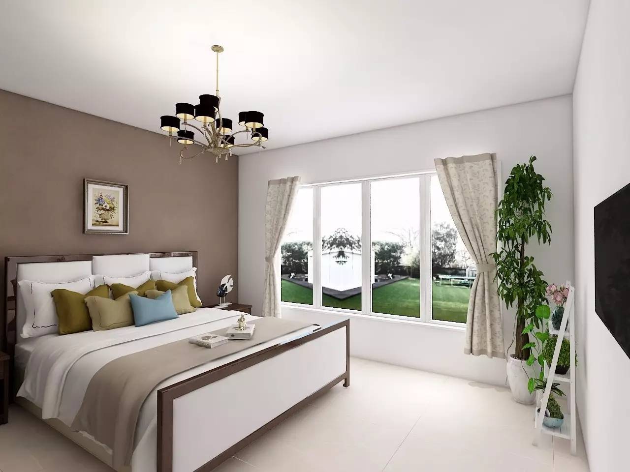 這款臥室裝修在顏色的設計上以純色為主,這樣的設計顯得非常的簡單清爽。臥室背景墻簡單的藝術掛畫顯得很有文藝范兒的感覺,陽光透過寬大的落地窗戶照射進來,讓臥室充滿了暖意。