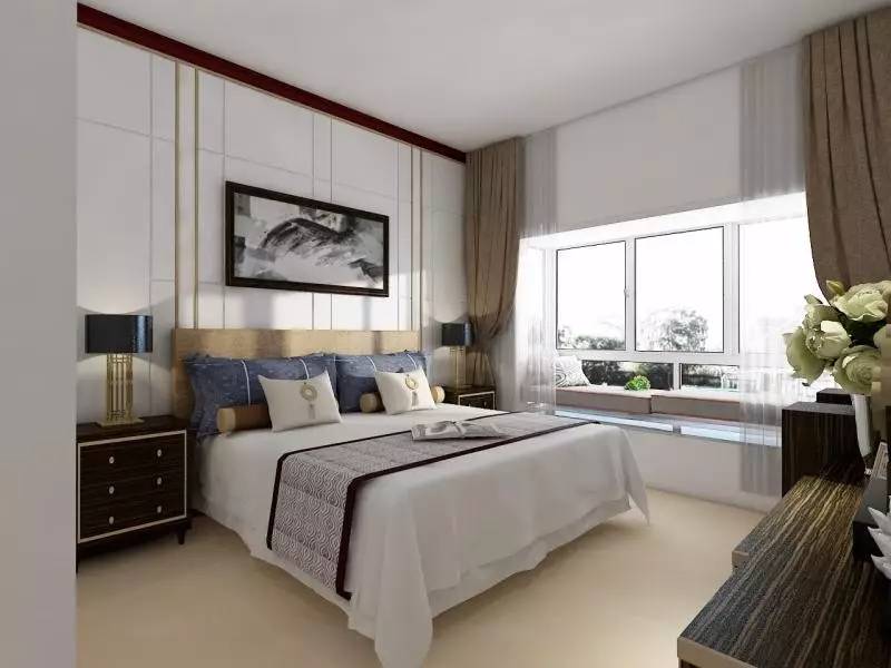 臥室選擇中性色系。中性色是由黑色、白色及由黑白調和的各種深淺不同的灰色系列,呈現“淡定、內斂、平衡”的柔和美感,配上恰到好處的中式家具,讓人從浮躁、緊張、亢奮的情緒平靜下來。