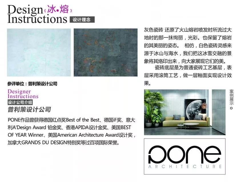 2017年最美瓷磚設計獎評選活動自1月啟動至10月截止報名,共收到來自全國各地設計師個人或機構共105套設計方案。最終,來自設計師蔣立的《星空》、設計師沈雨翔的《Every Step Counts》、廣州道勝設計有限公司的《竹石》、廣州普利策裝飾設計有限公司的《冰·熔》共4套瓷磚產品設計概念方案憑借著新穎的理念、獨具一格的設計脫穎而出,成功入圍,并在本屆紅棉獎頒獎禮中被授予“最美瓷磚設計獎”榮譽。