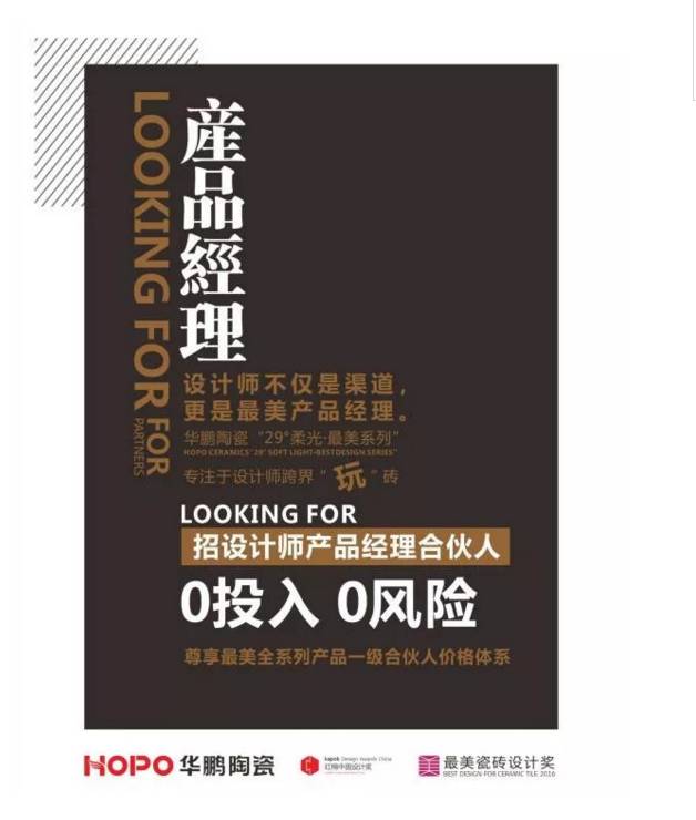 在2016年“廣州設計周”上,華鵬陶瓷對跨界設計做出大膽嘗試——推出“設計師產品經理合伙人”項目。攜手設計大咖,合力打造了 “29°柔光·最美系列” 瓷磚產品。