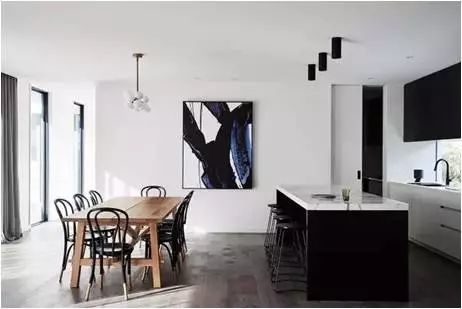 深灰色調(diào)為主,在色調(diào)上很沉穩(wěn)。局部點綴跳色,但也是低飽和度的顏色,簡練的裝點,冷靜的色調(diào)營造一種高級的理性空間。