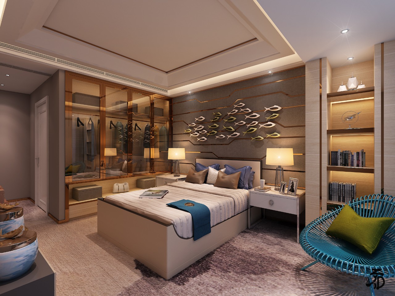 硬裝主色調搭用了中性的棕褐色,溫暖且不失沉穩的色調,再通過軟裝用一些點冷色調軟式去點綴,讓其空間有所對比。