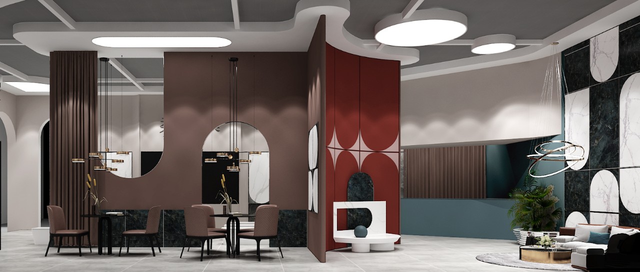 展館銜接處用鏡面進(jìn)行裝飾,將視覺進(jìn)行延伸。陶瓷與不同材質(zhì)碰撞共鳴,共同詮釋柔奢空間。