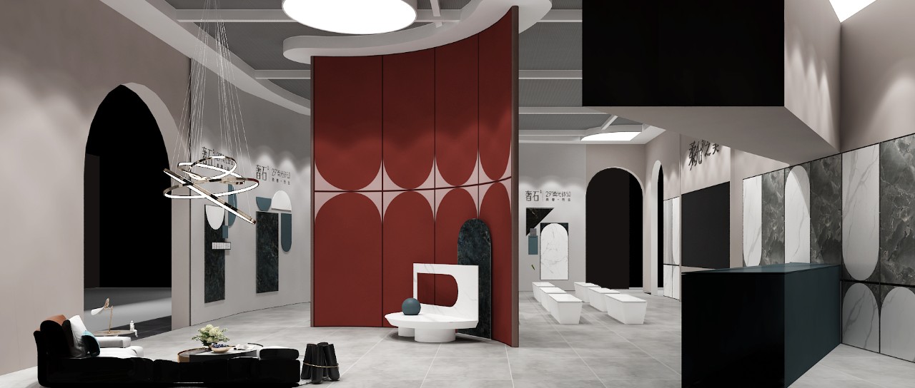 延續(xù)今年重裝新啟的總部新展廳,華鵬陶瓷此次設(shè)計周展位以“柔奢·而生”為主題,聚焦今年升級亮相的柔光5.0奢石系列產(chǎn)品。