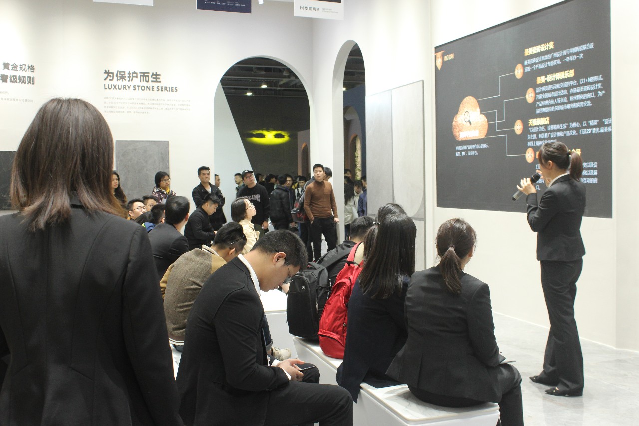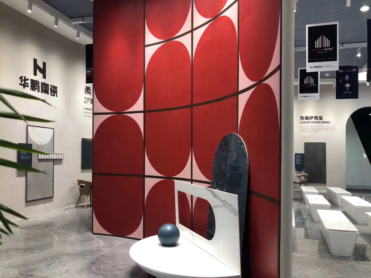 展位聚焦今年升級亮相的柔光5.0奢石系列新品, 通過產品的絲滑觸感,柔和舒視的觀感,具象華鵬“柔”的質感;陶瓷與不同材料的碰撞共鳴,共同展現華鵬的奢級質感。