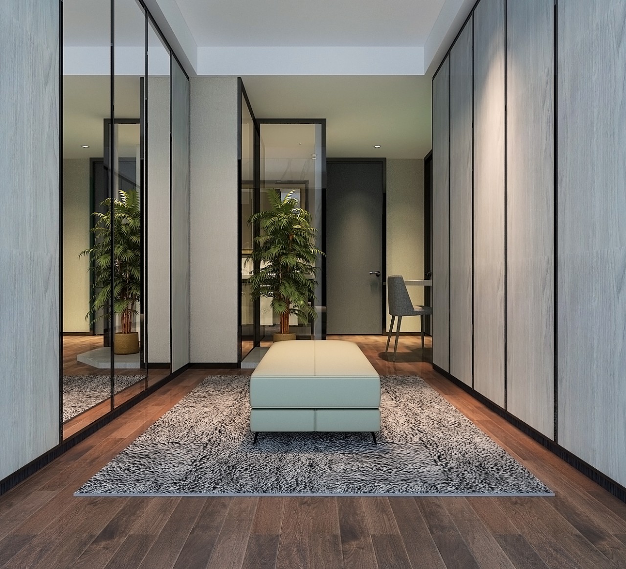 書房和臥室設計我們考慮到一個聯動,平時這是兩個獨立的空間,但是平常我們需要它敞開的時候,可以把門藏進去,形成一個空間。
