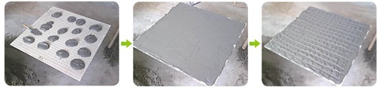 8、抹底漿:在產(chǎn)品背部抹上1:2水泥砂漿,刮平、掛勻稱,保證四邊都刮有砂漿且均勻,厚度大約是10mm左右,需要時可用梳子梳理,使效果更均勻。