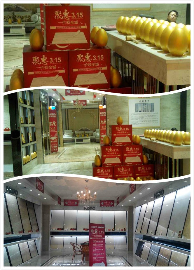 聚惠315,一價領全城活動在全國各地遍地開花,百花綻放第二季火熱進行中。華鵬陶瓷依托強大的品牌造勢和促銷活動,引爆了各地陶瓷消費的熱潮。良好的活動氛圍、終端銷量的激增,這些都離不開華鵬陶瓷總部人員與經銷商團隊的共同努力和配合。2015年我們期待華鵬陶瓷借助產品勢、渠道勢,以勢某市,終端銷售和業務拓展會取得更大的業績。