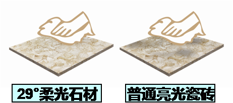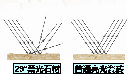 29度柔光石材顧名思義就是照射到瓷磚表面后形成29度光線漫反射。經科學實驗驗證,29度光漫反射最讓人覺得舒服的光線角度,故29度柔光石材與其它拋光類瓷磚的區別就在于此,她不但汲取了兩者之長,采用“2000目DP技術”精確的控制了光線的漫反射的角度,這又是一個區別于其他品牌類柔光瓷磚行業的一個技術亮點。