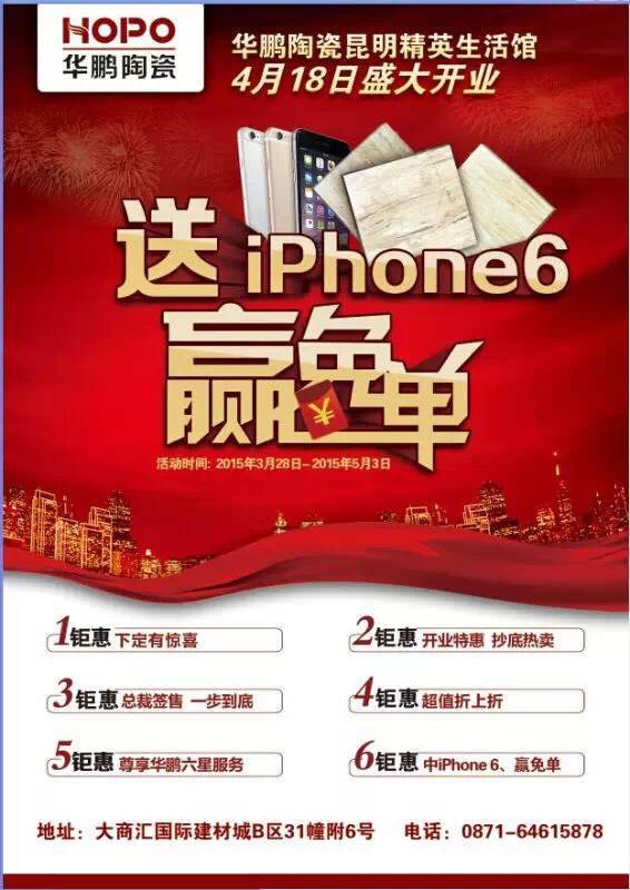 贏免單,送iphone6,還有美女人體彩繪等你來看——誰家陶瓷店開業(yè)這么隆重而又顯風(fēng)情?答案是——落戶于昆明大商匯建材市場的華鵬陶瓷昆明旗艦店在4月18日這一喜慶的日子盛大開業(yè)了!