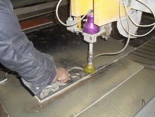 (4)、如使用手提電動鋸切割,因其操作難度大,必須安排有經驗的熟練工人操作,須確保所注射的冷卻流水始終對準移動中的切割點,并且首先切出面一道淺溝作為后繼深度切割的導向槽,借以保障鋸片始終順利向前,減少左右擺動而引發(fā)崩邊、損傷。