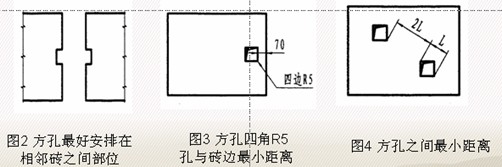 7、盡量將電閘盒方孔安排在兩塊磚之間接縫的兩側,亦即避免在磚片內部開孔。當磚片內部開設電閘盒方孔不可避免時,則孔邊與磚側邊的距離不應小于70mm。如同一塊磚內開兩個以上方孔,則易發(fā)生兩孔內側的鄰角頂點之間形成裂紋的情況,應該避免;如實在必須,則兩孔鄰角間直線距離須達到方孔對角線長度的兩倍以上。