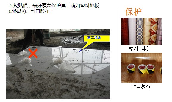 表面層:出廠前已貼好的表面保護膠膜,不但防止污染更能阻止沙粒劃傷。無論是干掛或者鋪貼,都一定要堅持到竣工并徹底清潔處理之后,才揭掉此保護膜。如磚面沒有保護膠膜,則應該及時在磚面上覆蓋如3mm-4mm厚紙板、地毯膠或木夾板保護。