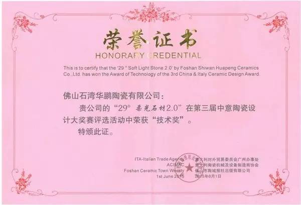 6月1日,中國陶瓷行業最具影響力的陶城報社,攜手意大利國家級政府部門——意大利對外貿易委員會,以及意大利陶瓷機械及設備制造商協會聯合打造最具價值的設計盛事——第三屆中國意大利陶瓷藝術設計大賽。當天在佛山新媒體產業園舉辦該次頒獎儀式,華鵬陶瓷送選產品——格蘭云天,以其清新自然、觸手可及的立體舒適視覺、紋理的獨特性、裝飾效果極佳等優勢,獲得行業的認可與組委會最權威的認證,斬獲本次陶瓷設計大賽的技術獎。