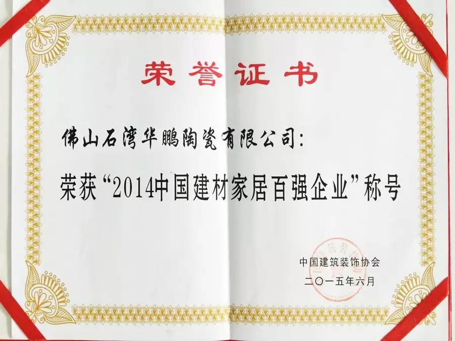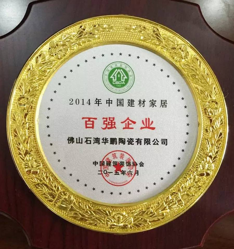 6月28日下午,在中國裝飾協會領導代表、行業專家、企業負責人和設計師逾千人的共同見證下,華鵬瓷磚榮獲中國建材家居企業100強榮譽稱號,再一次展示了華鵬陶瓷非凡的品牌實力。