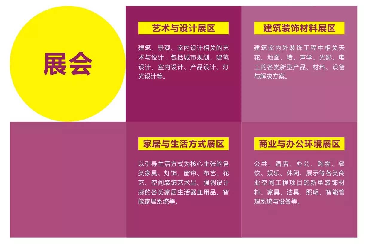 2015廣州設計周展會由“藝術與設計、家居與生活方式、建筑裝飾材料、商業與辦公環境”四大展覽組成,各類別設計賽事年度優秀作品將在現場展出。全方位、跨領域的締造設計行業盛事,旨在滿足“找設計、選材料、看家居、探趨勢”商機等一切商務互動需求。