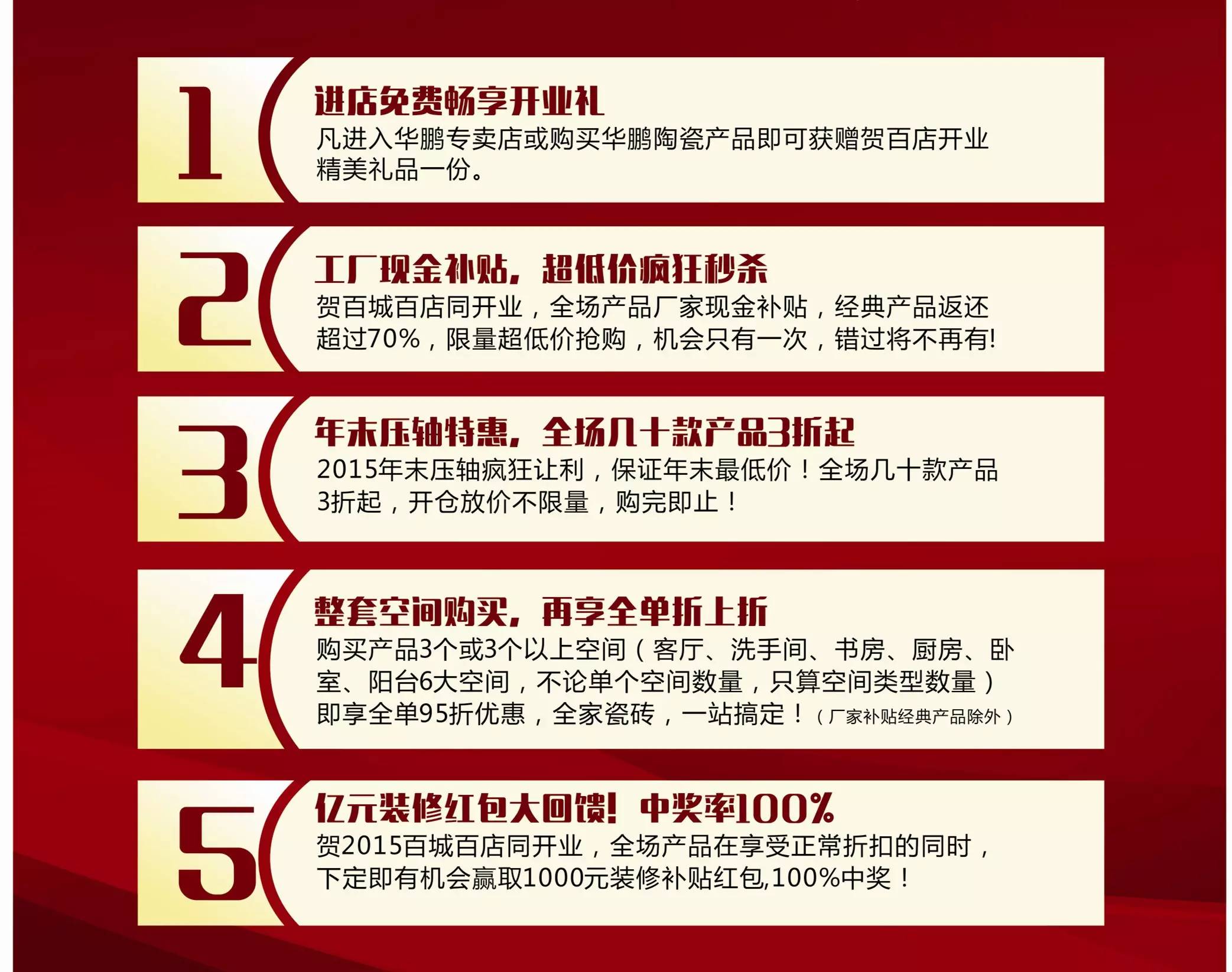賀2015百城百店同開業(yè),全場(chǎng)產(chǎn)品在享受正常折扣的同時(shí),下定即有機(jī)會(huì)贏取1000元裝修補(bǔ)貼紅包,100%中獎(jiǎng)!