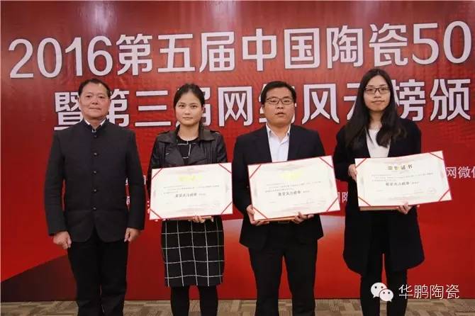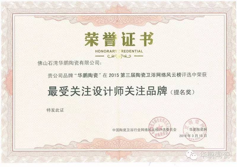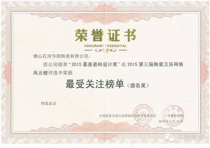 本屆風云榜共頒出“2015年度最受關注品牌 ”、“2015年度最受關注人物 ”等十五個獎項,其中華鵬陶瓷獲得風云榜"2015年度關注最受設計師關注品牌", "2015年度最受關注榜單"兩項提名大獎!