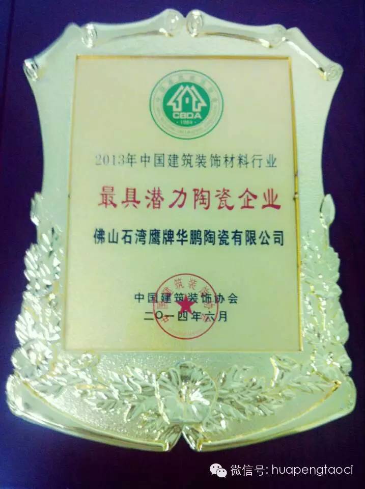 華鵬陶瓷榮獲2013年”中國建筑裝飾材料行業最具潛力陶瓷企業“