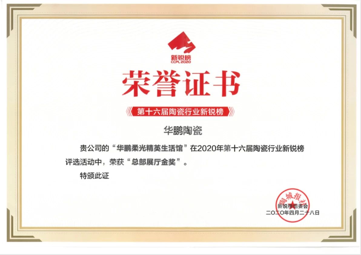 歷時5個半月的,行業年度創新大考——中國陶瓷行業新銳榜,于4月28日放榜,140+行業新銳力量在此集結。華鵬陶瓷2019年四位一體全新升級,技術+設計雙輪驅動,為品牌發展注入新勢能,開啟華鵬新征程,多項創新之舉也得到評審團認可,在2020年第十六屆中國陶瓷行業新銳榜中,斬獲“科技創新獎”、“總部展廳金獎”兩項大獎。