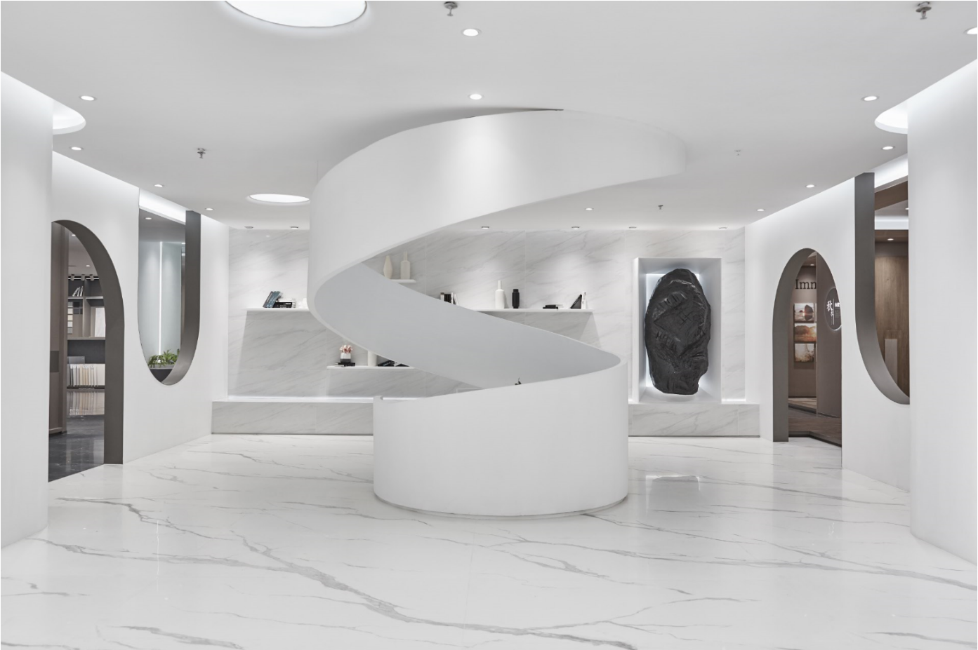 2019 年下半年,華鵬陶瓷總部展廳全面升級,在“不是設計展廳,而是讓展廳有設計感”設計理念下,華鵬全新展廳被劃分為分兩大區域:一樓形象大堂+設計師選材區和二樓“一磚一館一選材”的四大專項展館。