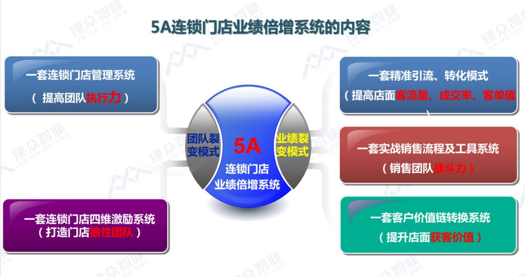 5A門店業績倍增系統,是廣州建眾針對終端門店團隊管理和業務管理兩大核心問題,打造的一套終端服務系統。