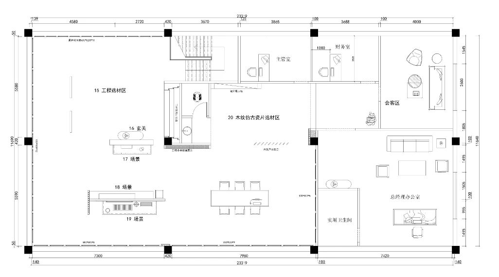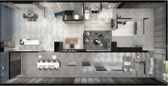 二層展示以華鵬工程產(chǎn)品為主,天花處理采用工裝展示的設(shè)計手法,結(jié)合工裝休閑場景展示,小樣品展示墻,打造針對工程渠道的全品類選材區(qū)。