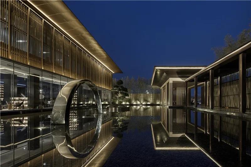 洽談區(qū)外安靜的水域,視線越過格柵,從室外一直延伸到室內(nèi),有機(jī)的把室內(nèi)外空間進(jìn)行了連接。