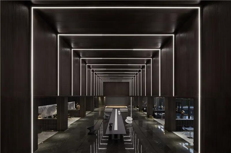 售樓部大廳放置有16米長的定制鋼板桌,在特殊活動(dòng)中有著不可替代的中心角色。