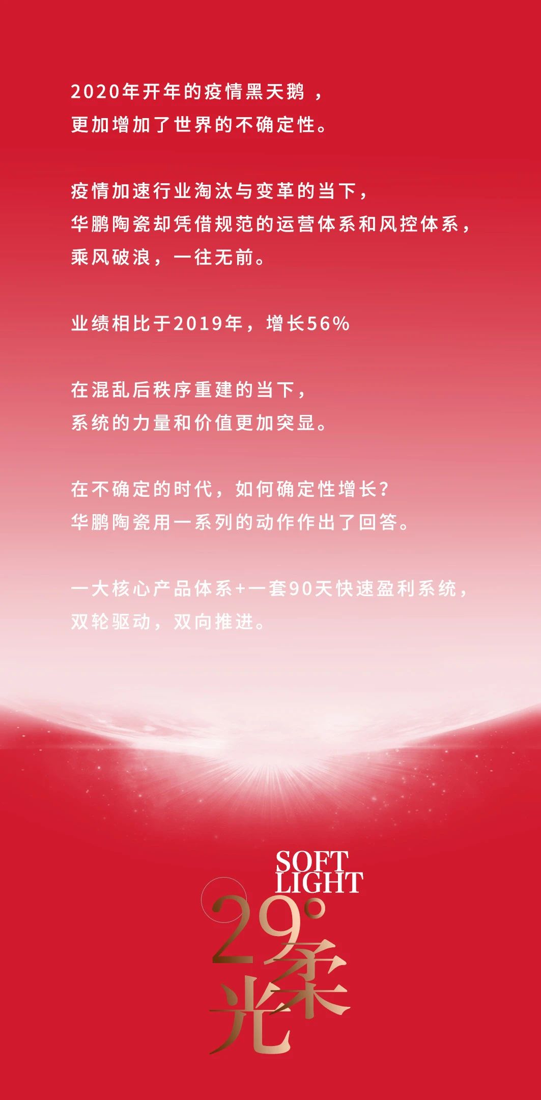 剛過去的華鵬陶瓷29柔光磚4.0新品發布會相信大家還記憶猶新。在這次發布會上,鷹牌集團總裁林偉說道: 對于我們而言,堅持就是一種信仰。 的確,從2013年開創柔光領域以來,華鵬陶