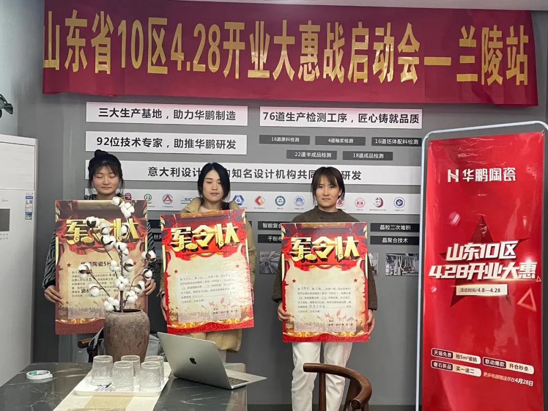 齊魯大地吹響號角,經(jīng)過16天的奮戰(zhàn),陶瓷十大品牌華鵬陶瓷5H門店業(yè)績倍增項(xiàng)目已進(jìn)入全面沖刺階段。4月18日,5H門店倍增系統(tǒng)項(xiàng)目在臨沂、班莊、滕州、壽光、郯城、蘭陵贛榆、日照、平邑、東海、沛縣10城啟動(dòng),華鵬陶瓷幫扶團(tuán)隊(duì)全程駐點(diǎn)幫扶,導(dǎo)入并實(shí)施5H系統(tǒng)內(nèi)容,通過終端門店規(guī)范、高效團(tuán)隊(duì)打造,實(shí)現(xiàn)了終端業(yè)績倍增。