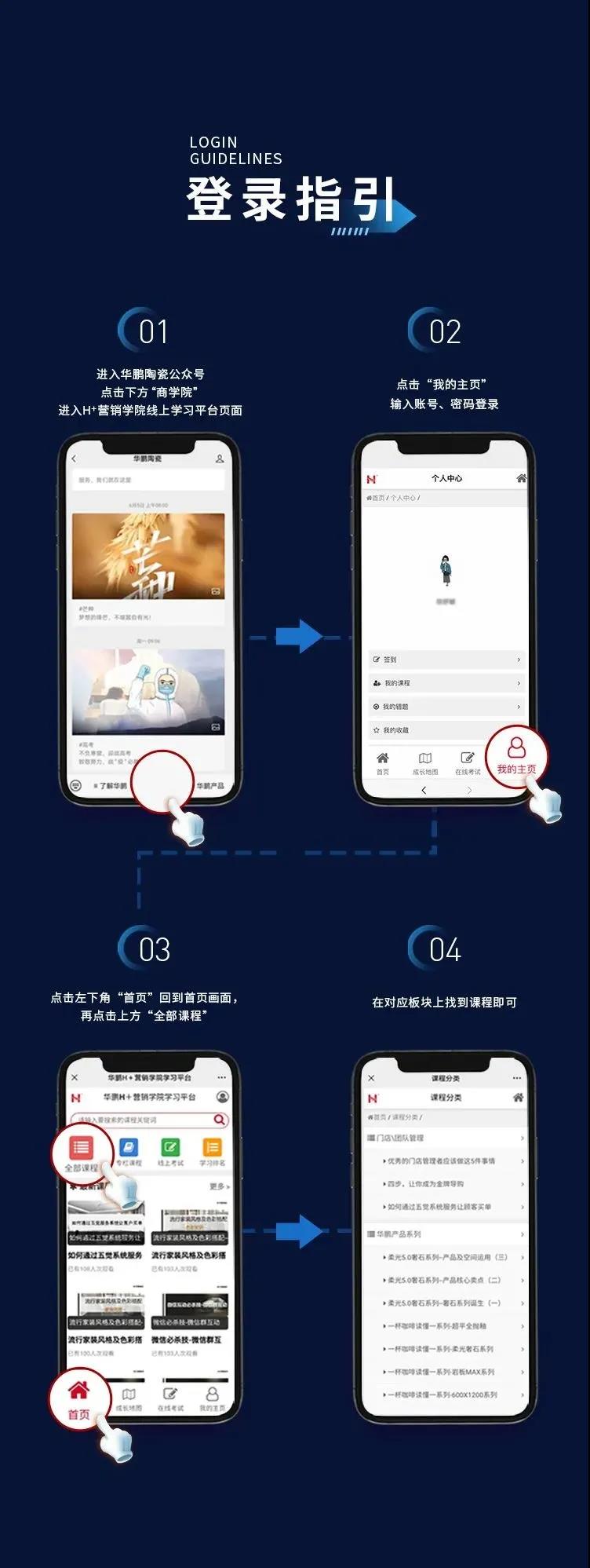 用戶可從華鵬陶瓷微信公眾號、小程序、官網多訪問入口,進行定期“線上”培訓,PC端、移動端同時適配,微信公眾號底部菜單欄一鍵直達,給終端帶來數字化時代更便捷的體驗,滿足隨時培訓需求。