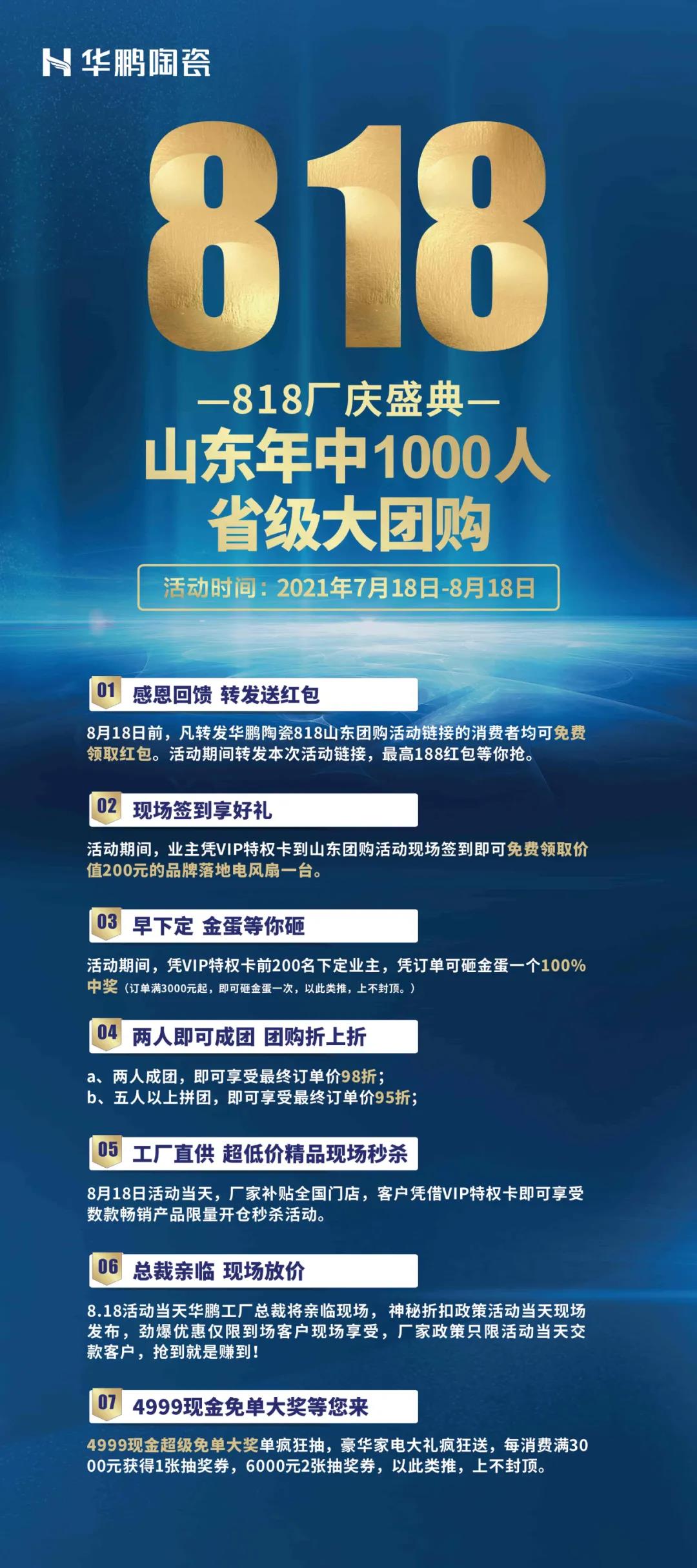 在90天快速盈利系統的指導下,總部加強對于終端的幫扶力度,此次“華鵬陶瓷818廠慶盛典暨山東年中1000人省級大團購”火熱進行中,在山東地區掀起一片熱浪。