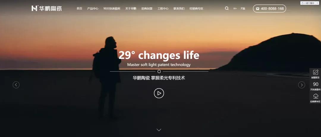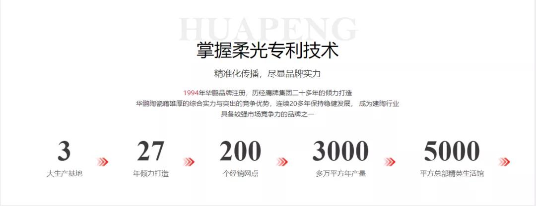 官網在設計中,整體源自華鵬的logo主色調,嵌入眼簾的品牌形象宣傳片,讓用戶第一時間了解品牌,頁面整體布局去繁化簡,以精簡的欄目框架、干練的數字,凸顯信息重點。首頁頂部華鵬陶瓷,掌握柔光專利技術,以視頻展現,品牌優勢直達受眾。