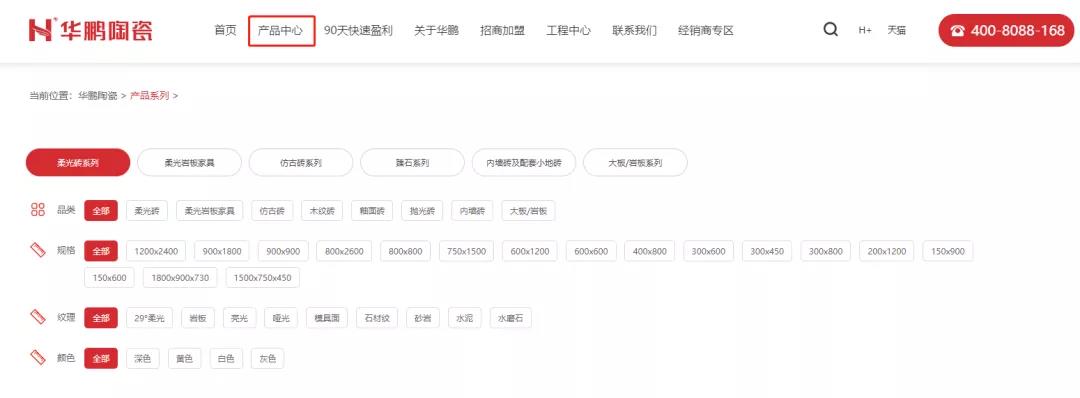 對于產品欄目也進行了重點打造,對系列、規格、風格等逐一進行分類,多維度