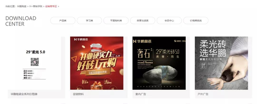 在欄目中可以看到,我們新增經銷商專區欄目,其中包括產品類、學習類、平面物料類、榮譽與資質、會員中心、價格牌系統,并為每一位客戶創建了賬號,登錄賬號密碼,即可在專區下載自己所需要的資料。