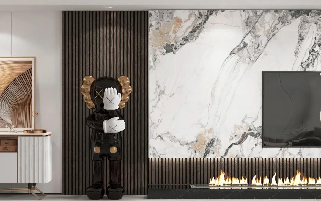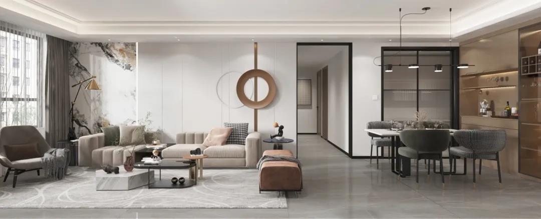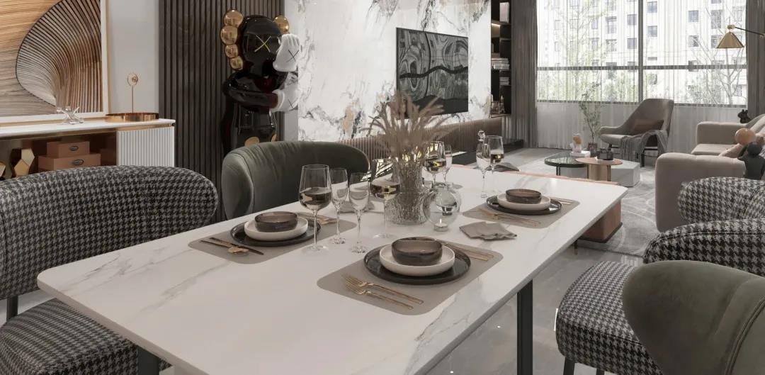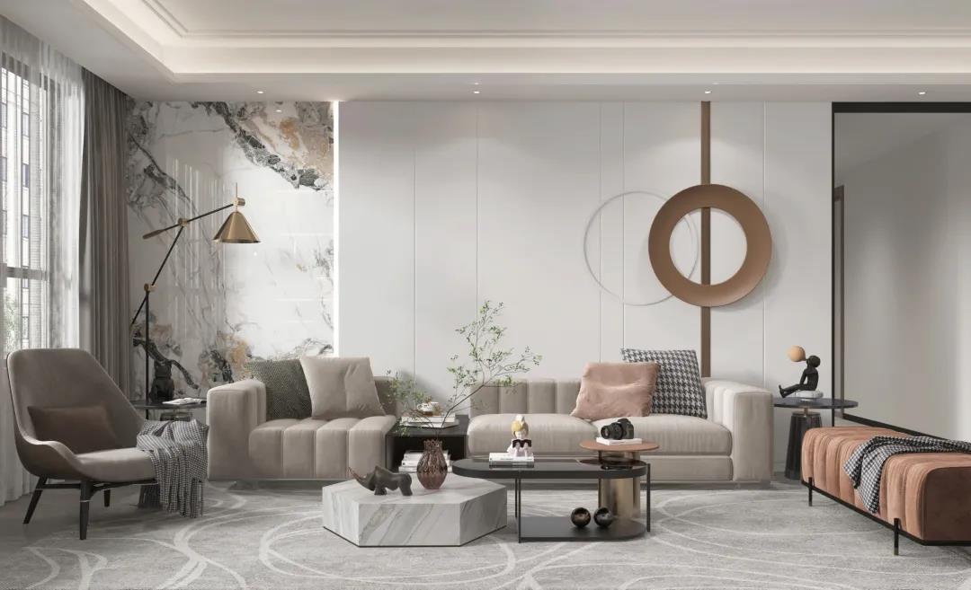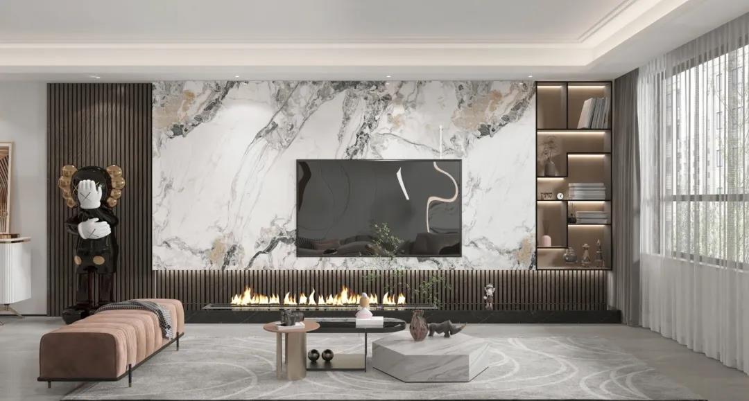 背景墻選擇陶瓷一線品牌華鵬Max系列無線連紋巖板,獨特的紋理起到了畫龍點睛的作用,讓客廳設(shè)計更加分。