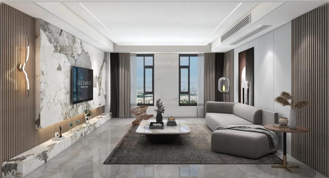 設計師選用陶瓷一線品牌華鵬陶瓷高級灰作為空間的主色調,搭配連紋背景墻作為空間的主筆,打造出具有人文氣韻的水墨意境。大開大闔,空間層次感因此變得更加豐富。地面采用 愛馬仕大象灰L9LA02AH 900*1800柔光磚,簡單而不失格調,深灰色的沙發使得空間更加沉穩,提升了空間的質感。表達了業主的生活態度、情感需求與審美品質。