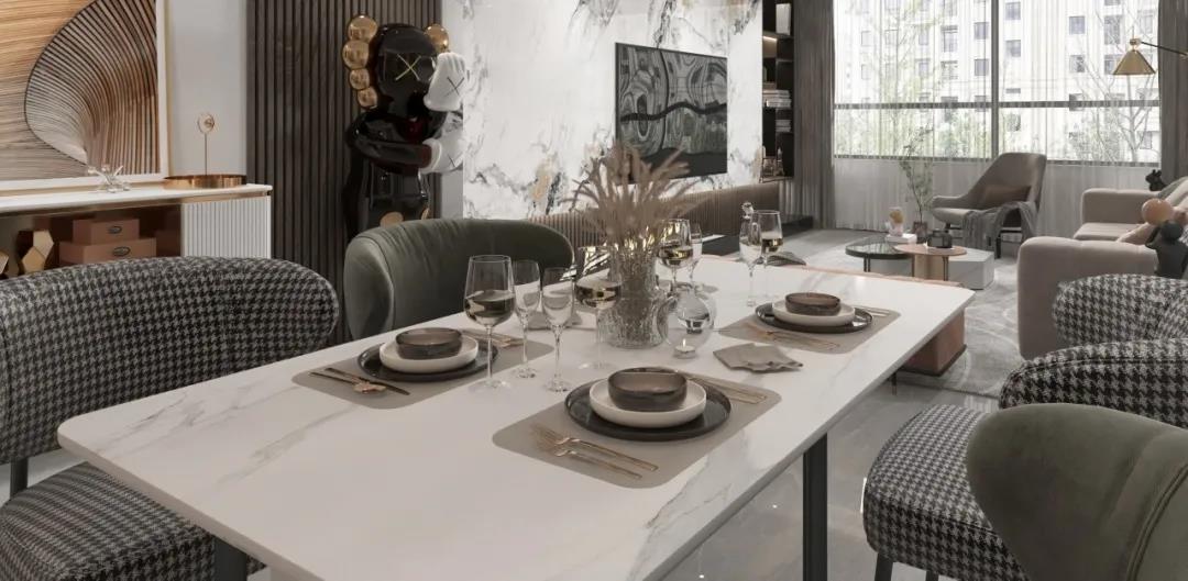 餐廳與廚房位于同一空間,在客廳的旁邊,設計很好地利用了空間。餐臺選用白色大理石面板增添了空間的輕奢氛圍,疏密有致的自然紋理相互呼應,整體簡約而精致。餐桌上方的裝飾植物展現了空間的生活美學。