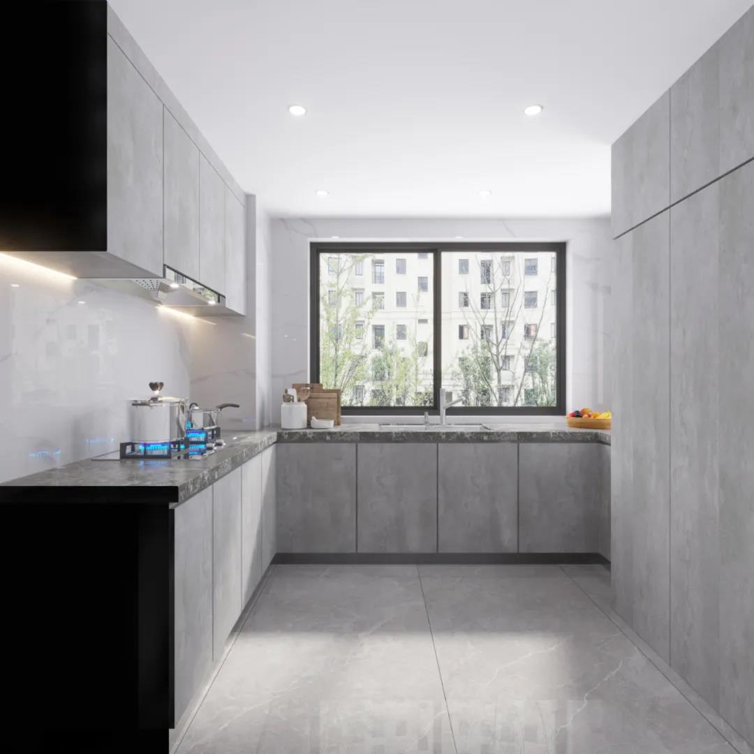 廚房呈L型,以冷灰為主色調,展現了空間的幾何美感。細膩的石紋,呈現出深淺不一的交織感,加以大窗設計引入光線,為空間增添了一絲明亮氣息。