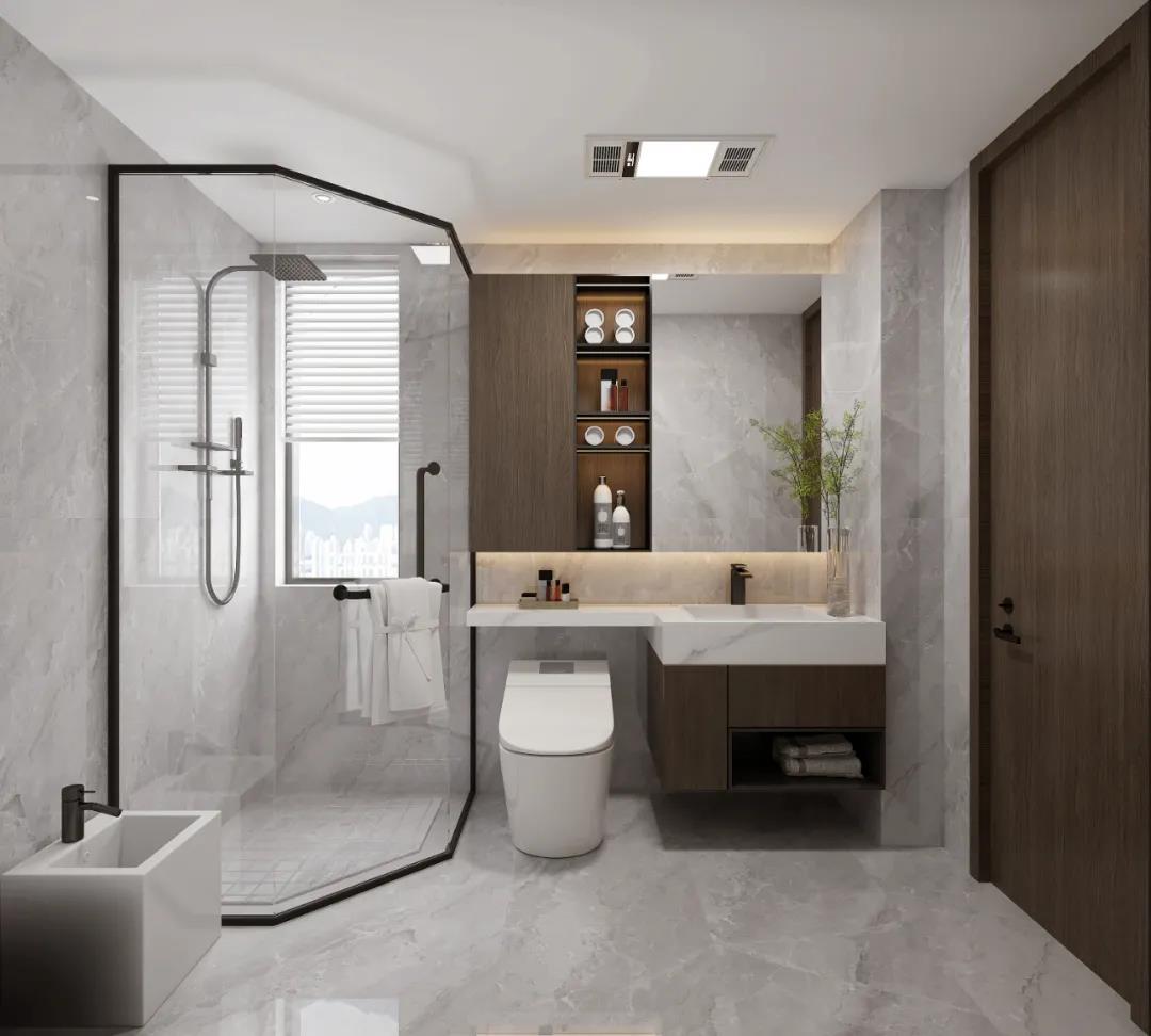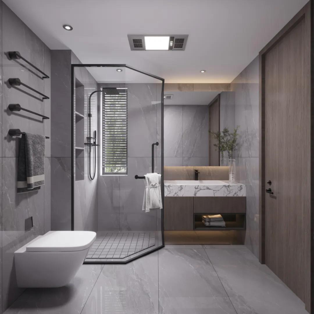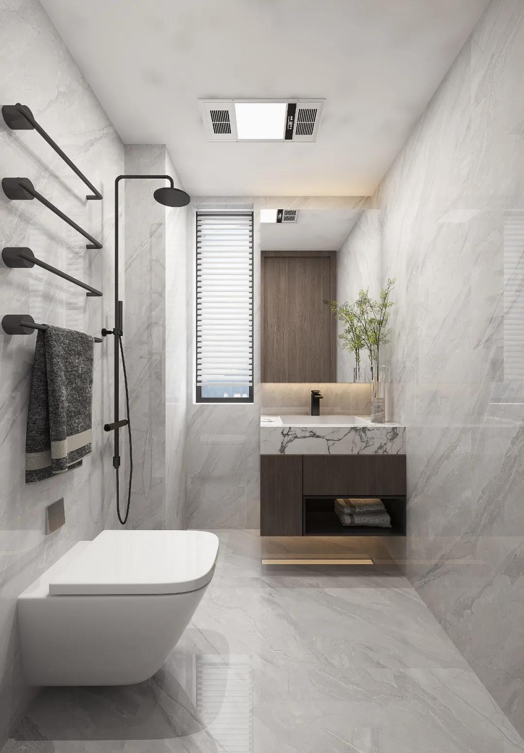 內衛空間,設計師選用灰色作為空間的主色調,營造柔和的空間氛圍。大理石洗手臺賦予空間輕奢氣息,美觀大方。