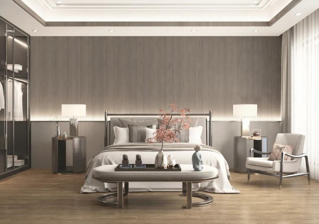 端莊豐華、清雅含蓄的東方美學與現代潮流相碰撞。配色上采用了低調沉穩色調,來營造出和諧沉穩的氛圍。木質電視墻墻增添了書香氣息,強調東方的意境,引人入勝。