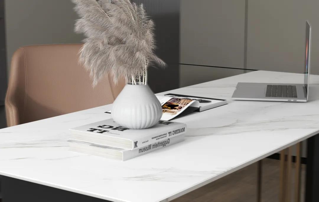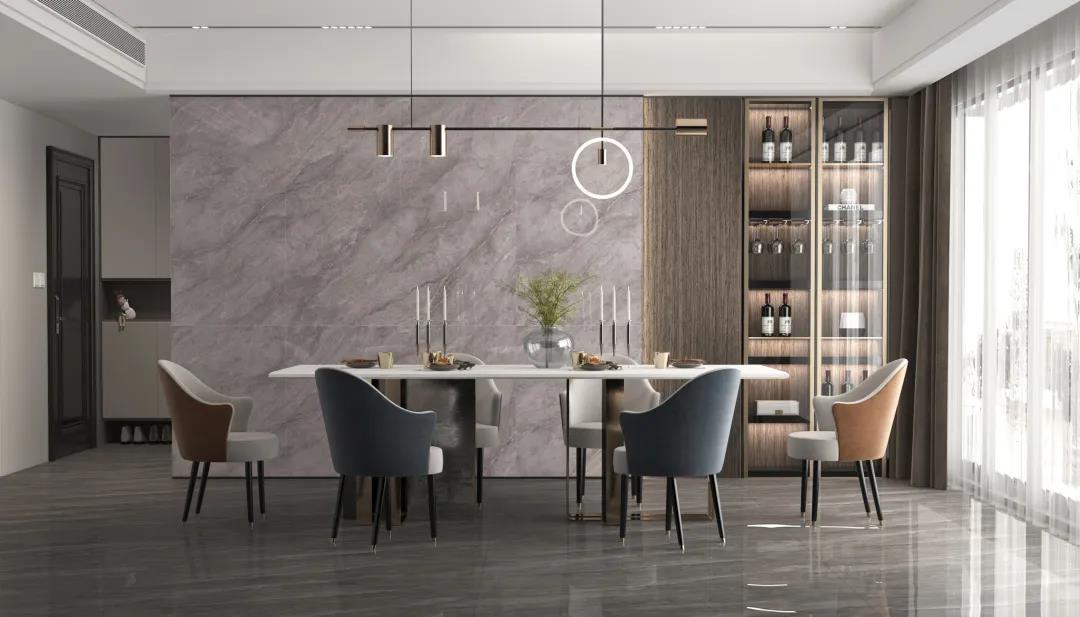 華鵬陶瓷900x1800mm規格巖板除了作為背景墻,由于其超高耐磨、無懼滲污、材料環保、柔光/亮光雙重光感、12mm厚度承重穩妥等性能,衍生出華鵬29°柔光巖板家具,29°柔光巖板家具款式多樣可定制,滿足不同需求消費者。