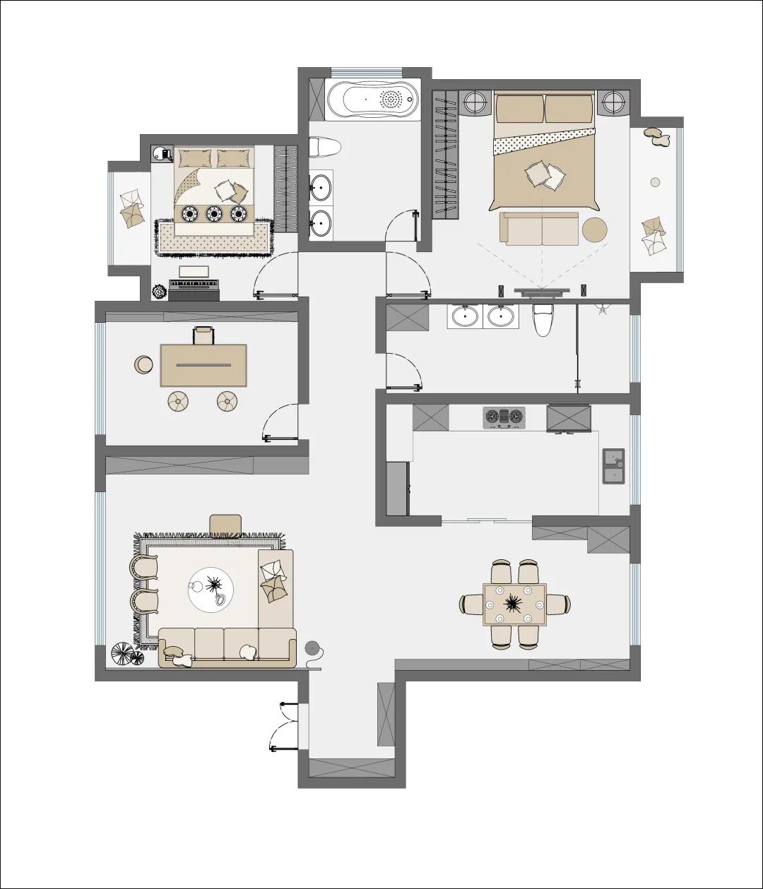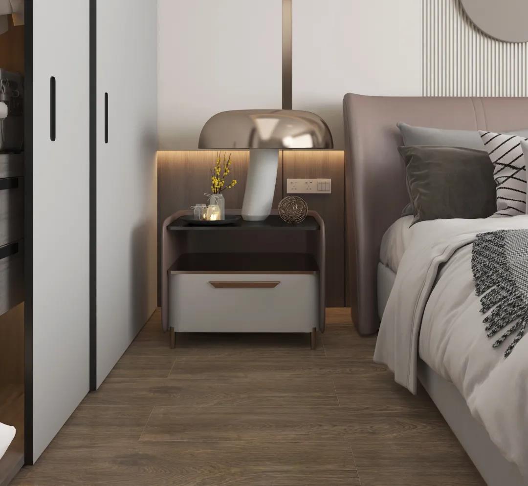 本案中以柔奢為落腳點,選用華鵬29°柔光磚打造出空間的柔,同時應用了天安新材墻地專家的硅藻泥科技板,健康、無毒、無味能有效縮短裝修周期,居住環境更健康,是高質要求人群的裝修首選。
