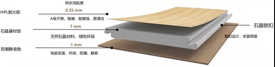 石晶即天然石粉和環(huán)保樹脂復(fù)合材料。以環(huán)保石粉和PVC為原材料,石粉即將巖石粉碎成粉,PVC則屬于人工合成材料,取材皆不會破壞自然環(huán)境,兩者攪拌均勻后再經(jīng)高溫擠壓制成復(fù)合板材。石晶基材在制作過程中不用膠水,所以不含甲醛、苯等有害物質(zhì),是真正的0甲醛綠色環(huán)保地板。