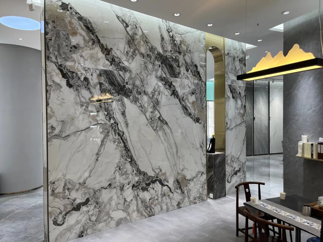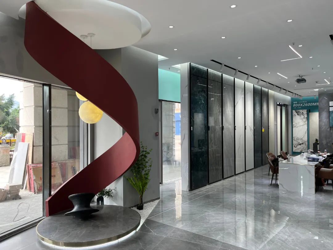開門見景,旗艦店大門采用弧形設計,用色彩碰撞的方式吸引眼球。直入眼簾的是品牌展示中心,大廳作為中心地帶,也是接待客人最重要的地方,大廳采用29°柔光900*1800寶格麗冰河白連紋產品,高級感十足。