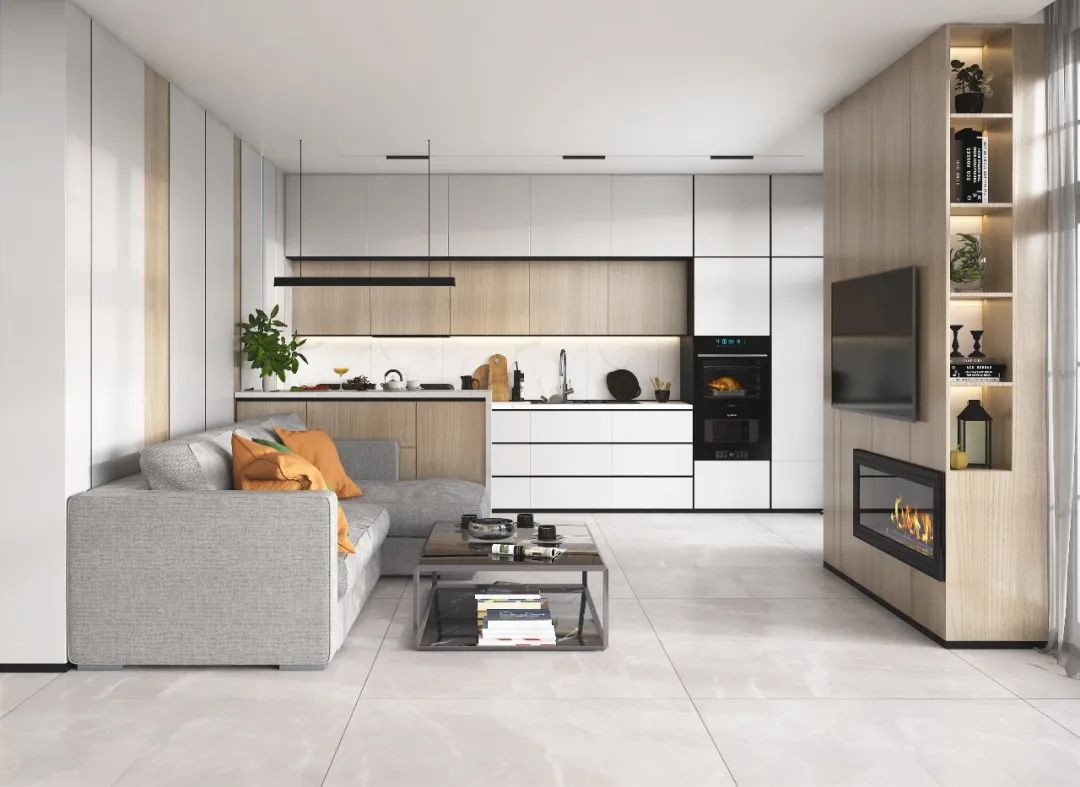廚房的設計手法較為樸素,大面積的29°柔光原木色櫥柜碰撞,讓餐廚區呈現沉穩克制的極簡感,沒有絢麗的色彩,只有低調而親切的膚質觸感,原木色與白色形成的對比,帶給空間極致而舒適的感受。